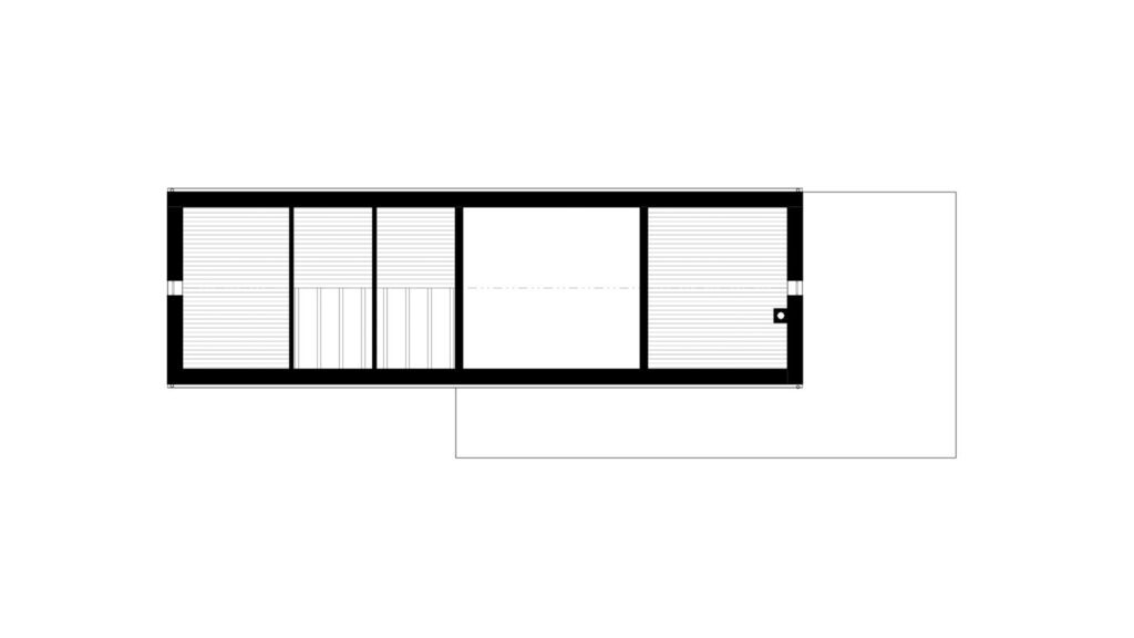 Na východní část domu je přisazena dřevěná kůlna, která kontrastuje se světlou omítkou domu. Pod štítem domu přechází v kryté stání pro auta a zároveň ukrývá a chrání vchod do domu. Z druhé strany na kůlnu navazuje krytá terasa, jejíž zábradlí je v ladícím dřevěném provedení. Nachází se na ní venkovní posezení se závěsným křeslem a modrou lavicí, jejíž pomyslné dvojče stojí na nekryté části terásky mezi okny na jižní straně s výhledem do zahrady.