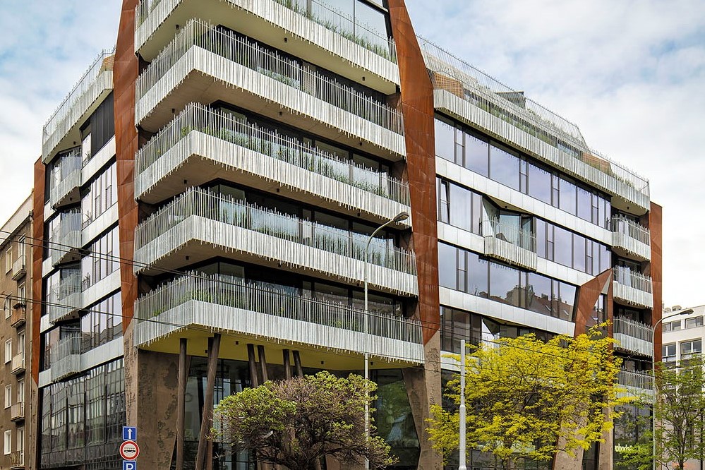 „V jedné z klíčových ulic centra dolních Holešovic jsme chtěli vytvořit místo s výrazným a atraktivním nárožím, vstřícné pro kolemjdoucí. Korunovali jsme křížení ulic a vytvořili jasně rozpoznatelný dům. Ulici jsme rozšířili na úkor půdorysné plochy našeho pozemku. Vznikl tak prostor před hlavními vstupy, naplněný chladivou zelení, která vytváří malou oázu na jinak poněkud monotónní hlavní ulici. Zeleň lemuje i okolní prostor, vine se do vyšších pater budovy po několika tenkých sloupech a je tak vynášena až na nárožní věž,“ říká architekt Stanislav Fiala.