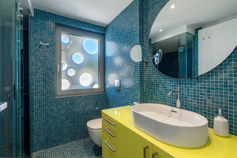Na rozdíl od celkového decentního stylu jsou koupelny vyzdobeny modrými dlaždičkami evokujícími hlubiny moře a kontrastujícími zářivě žlutými skříňkami. Unikátní je rovněž venkovní stěna, zdobená opět kruhovými otvory různých velikostí, které vizuálně působí jako „bubliny“. Tyto dekorativní elementy najdeme nejen u koupelen, ale i na balkonech ložnic.